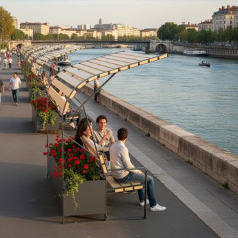 L’Ombrière Forézien est une ombrière urbaine végétalisée, spécialement conçue pour les collectivités, les paysagistes et les architectes recherchant une solution d’ombrage durable et esthétique. Imaginée par notre bureau d’étude TF LAB, elle réunit trois fonctions essentielles : l’ombrage, l’assise (2 à 3 personnes) et la végétalisation grâce à sa jardinière intégrée.